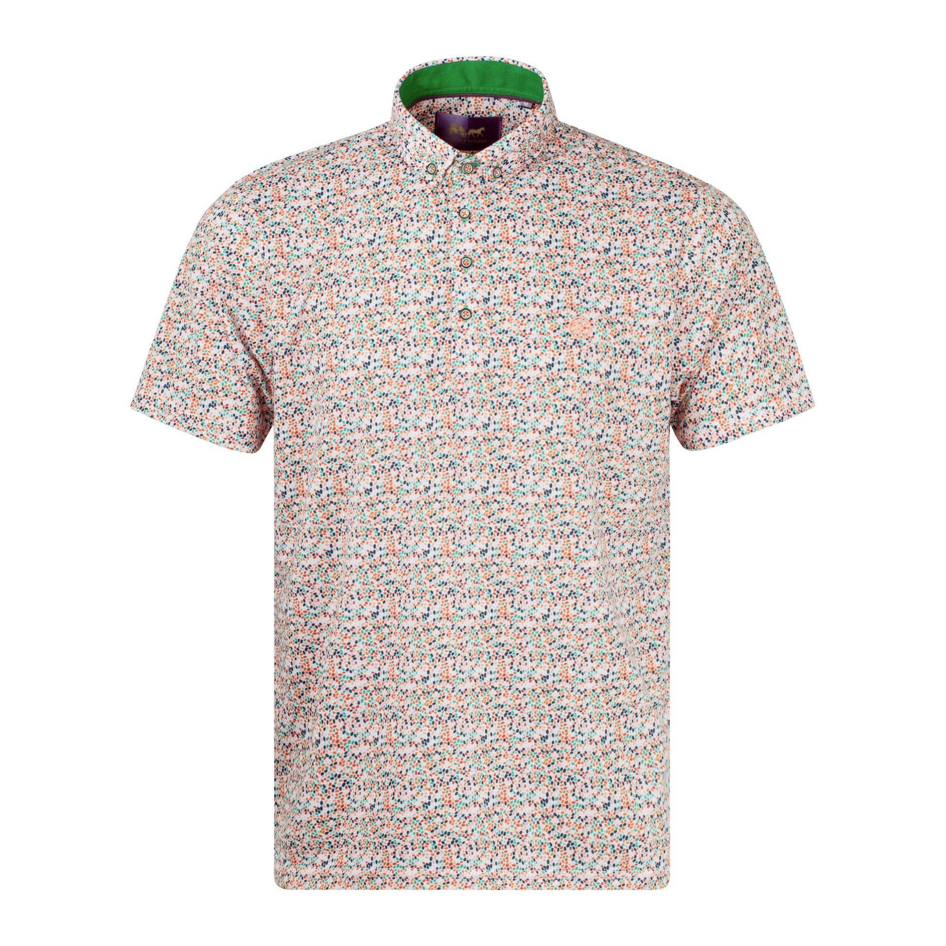 The Spots Print Polo Shirt in Peach by Arthur & Russell is available for purchase here at Urban Menswear.