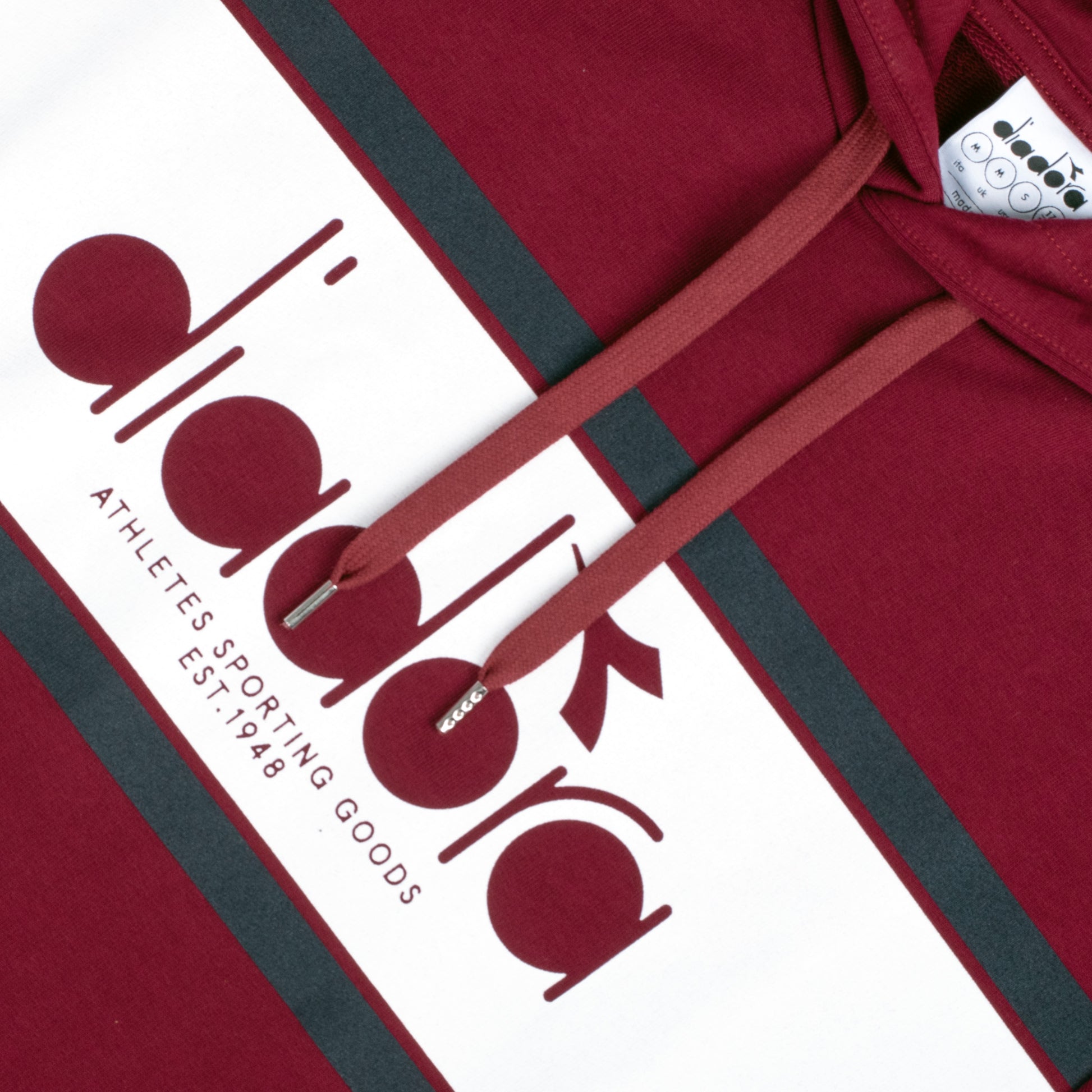 The Stripe Logo Hoodie in Empire Red (Claret) by Diadora is available for purchase here at Urban Menswear.