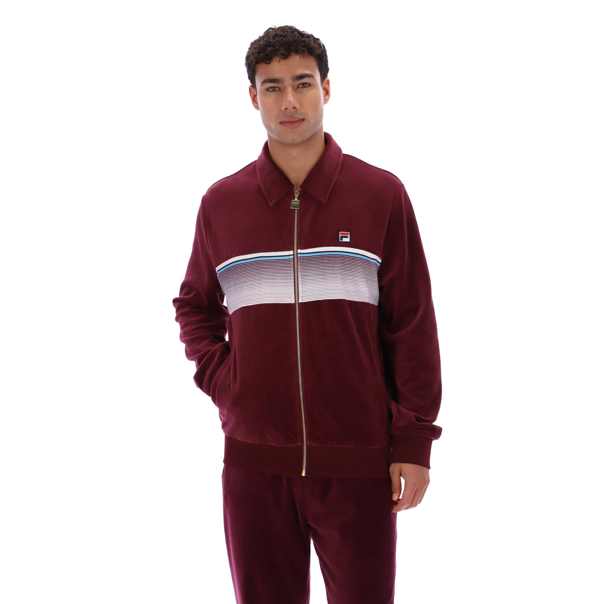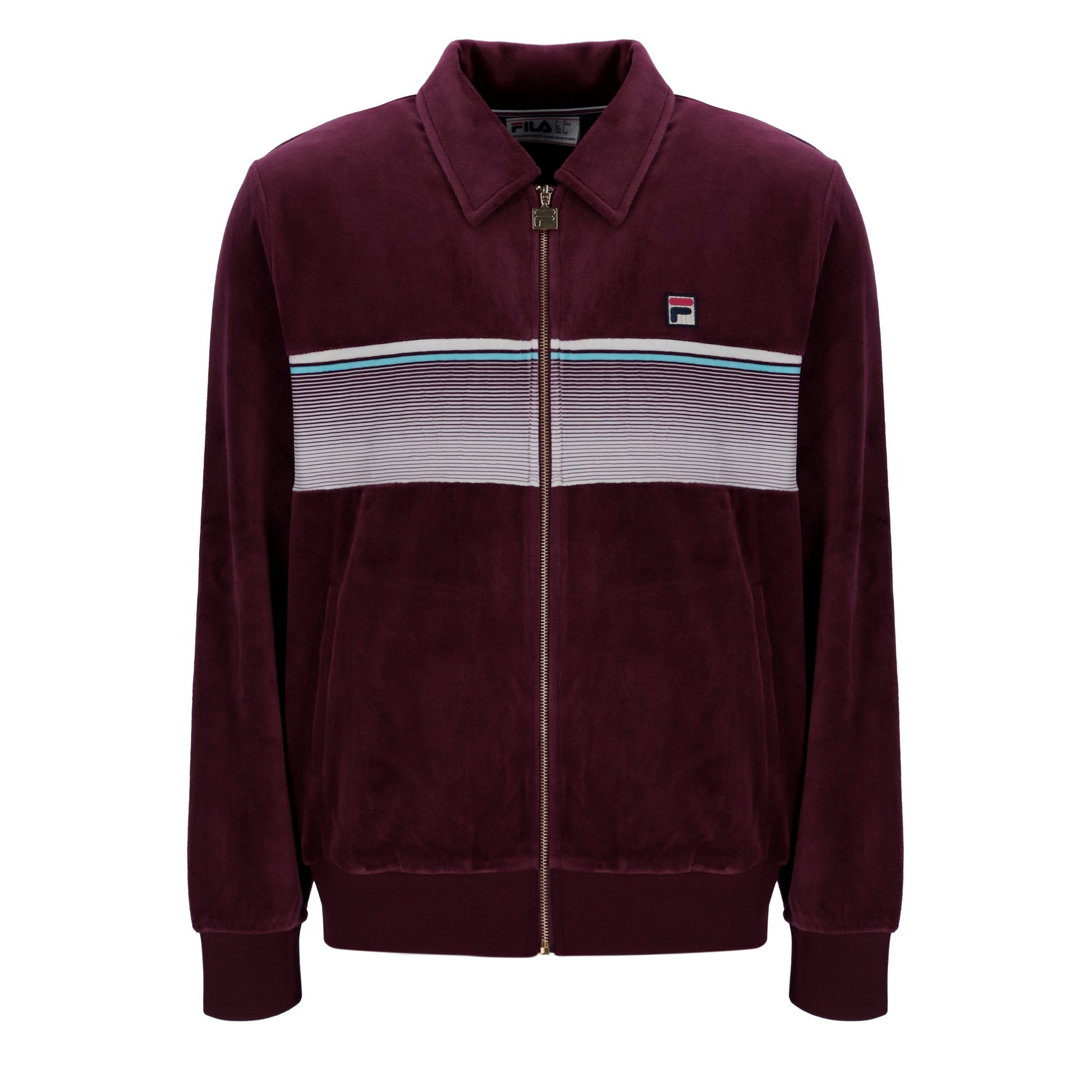 The "Malakai" Velour Track Top in Fig (Burgundy) by Fila Vintage is available for purchase here at Urban Menswear.