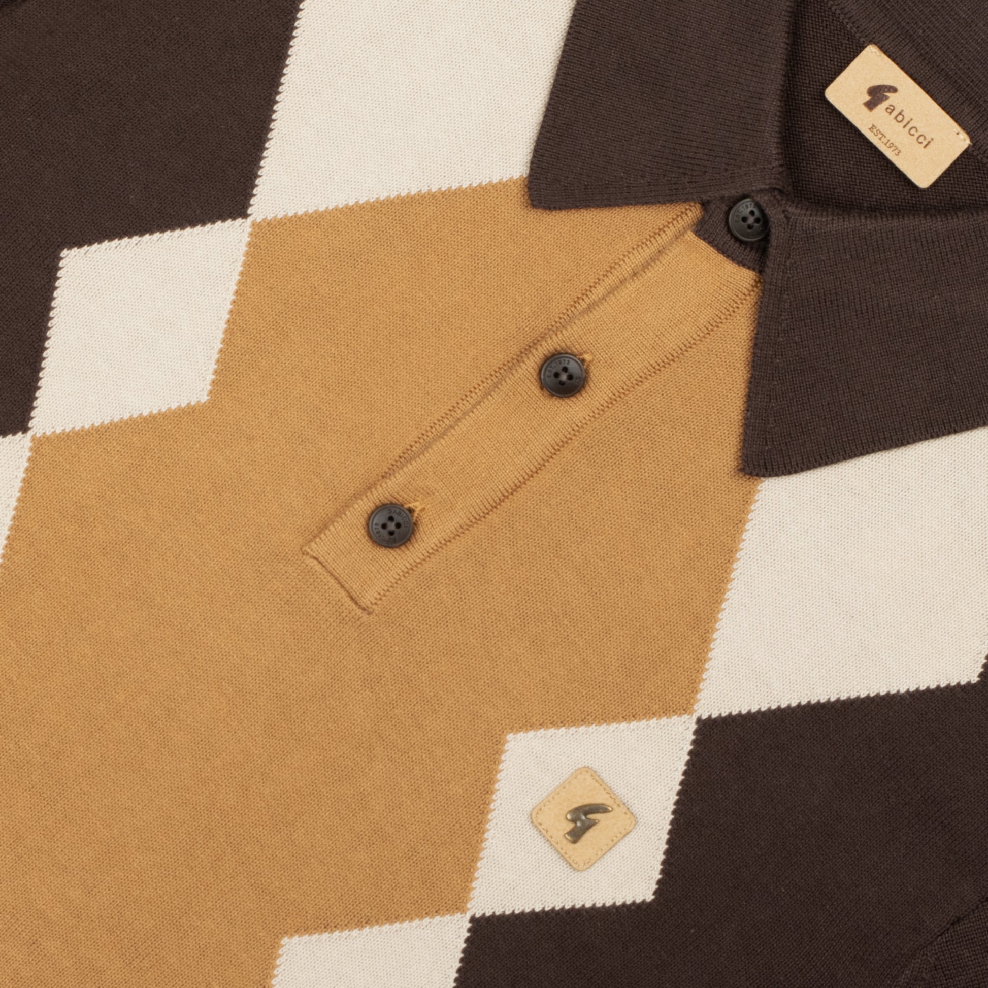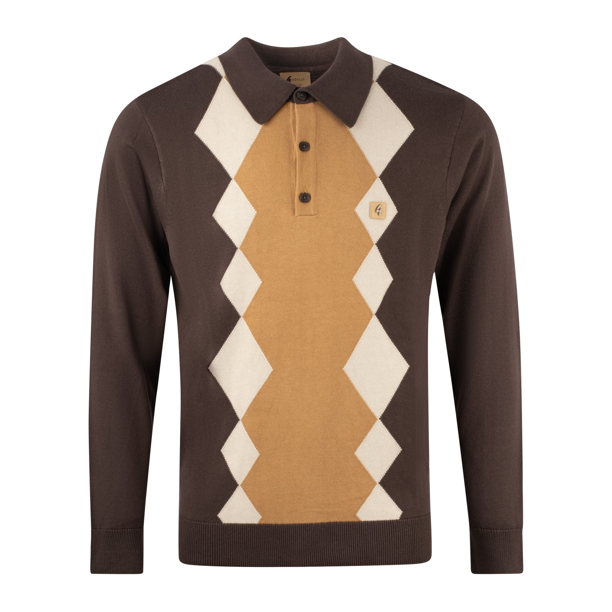 The Gabicci Vintage "Bond" Argyle Knitted Polo Shirt in Clove Brown is available for purchase here at Urban Menswear.