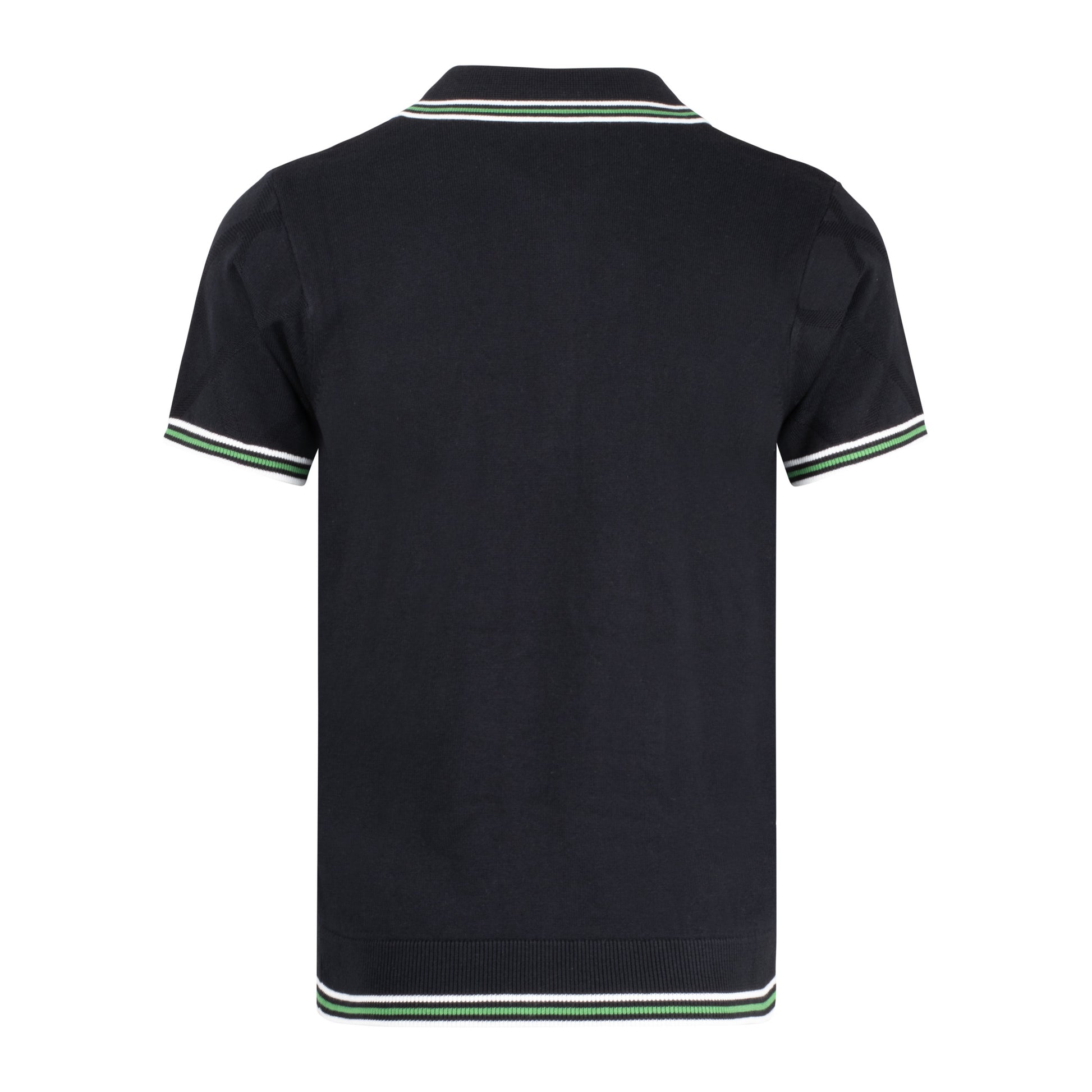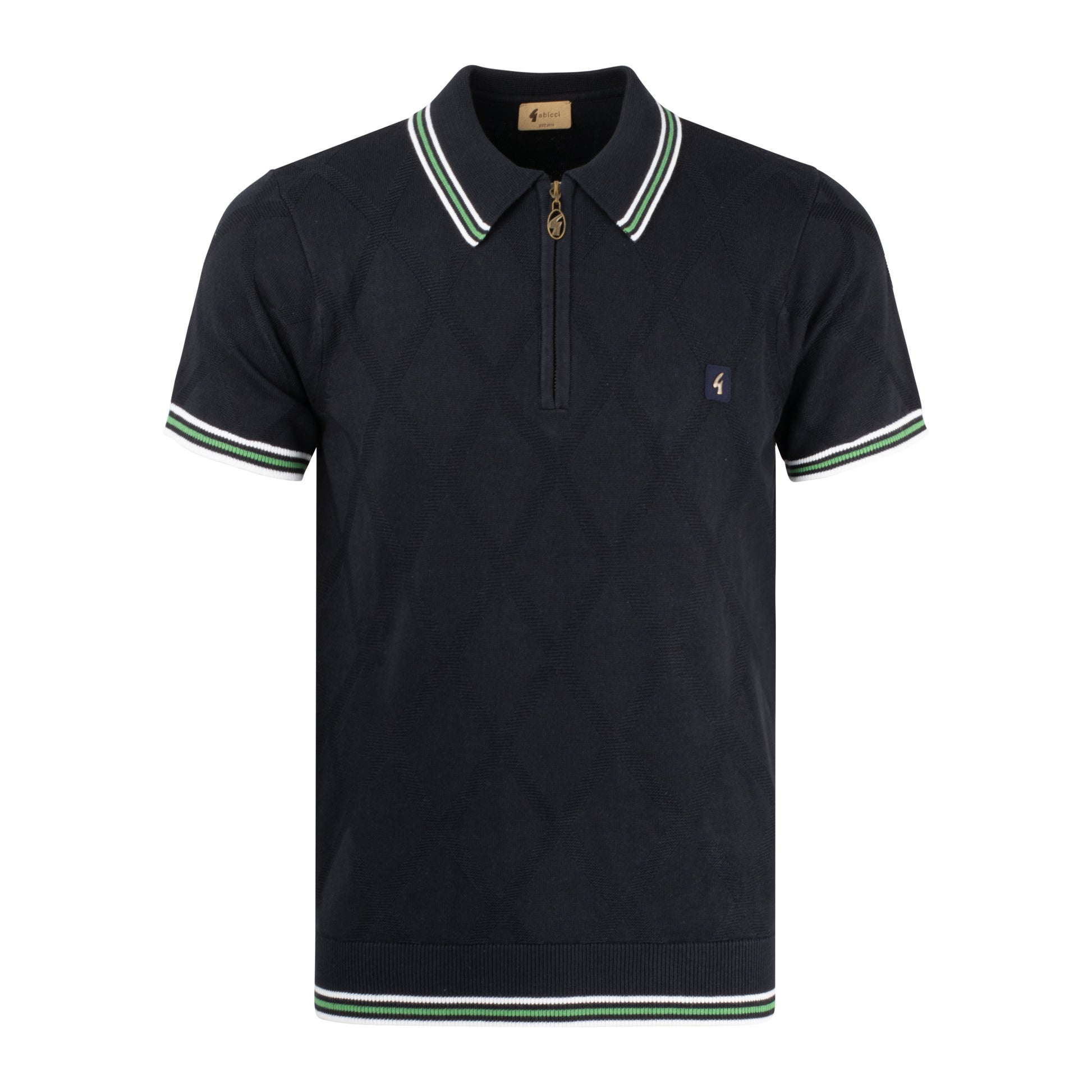 Sporting a tonal argyle design on the torso and crafted from fine gauge knitwear in a Polo Shirt silhouette with Short Sleeves & ribbed cuff hems. Finished with a tipped collar and zipped neckline.
