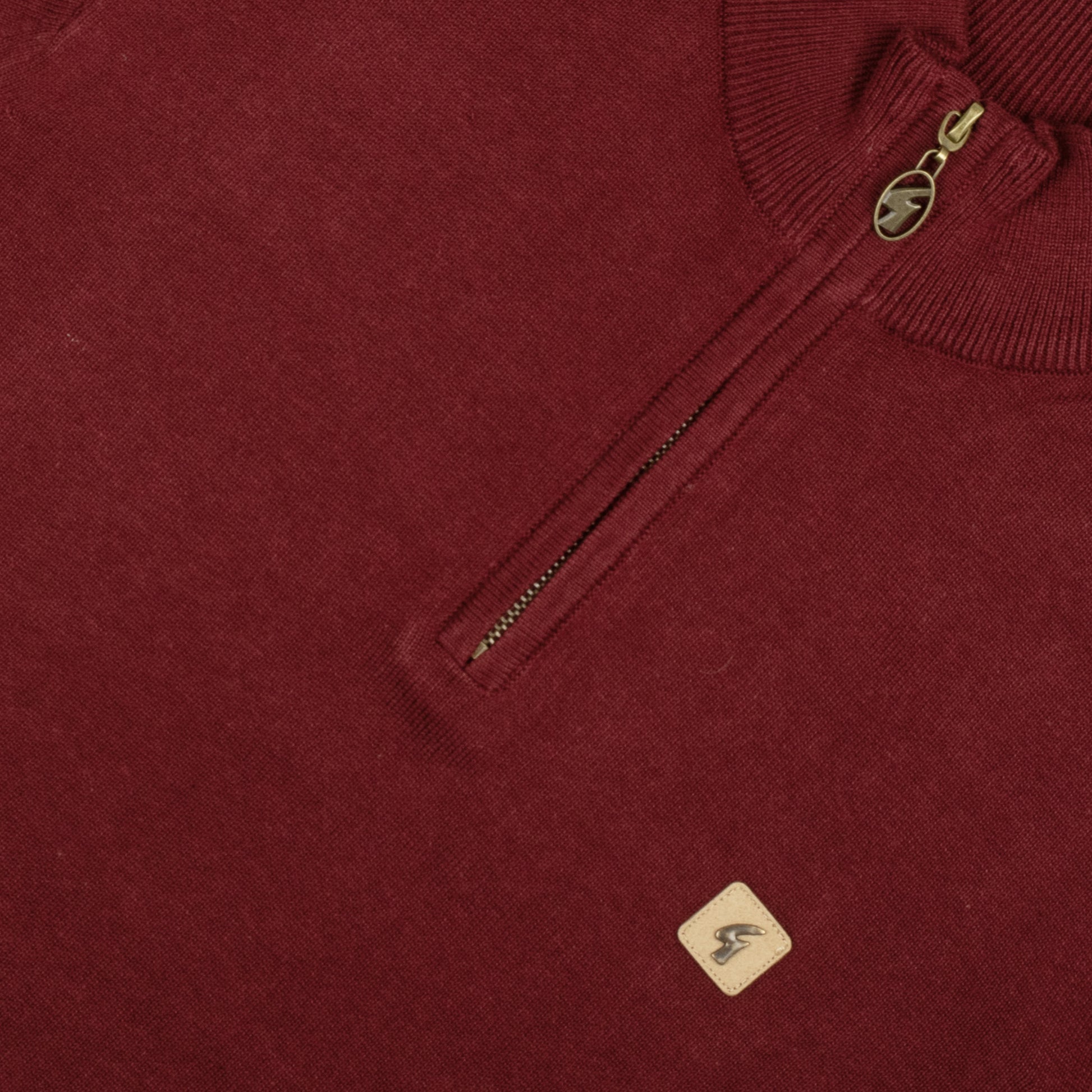 The Gabicci Vintage "Naxton" Knitted Quarter Zip Sweater in Berry (Burgundy) is available for purchase here at Urban Menswear.