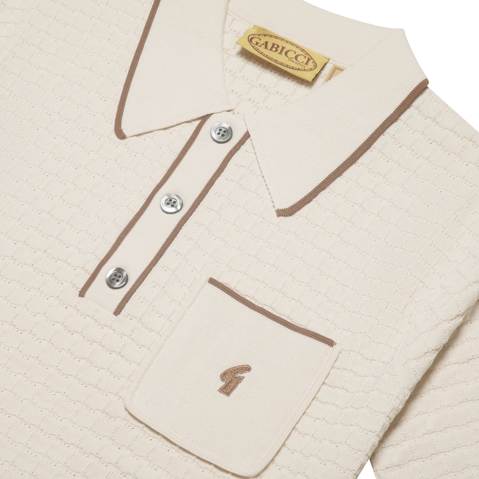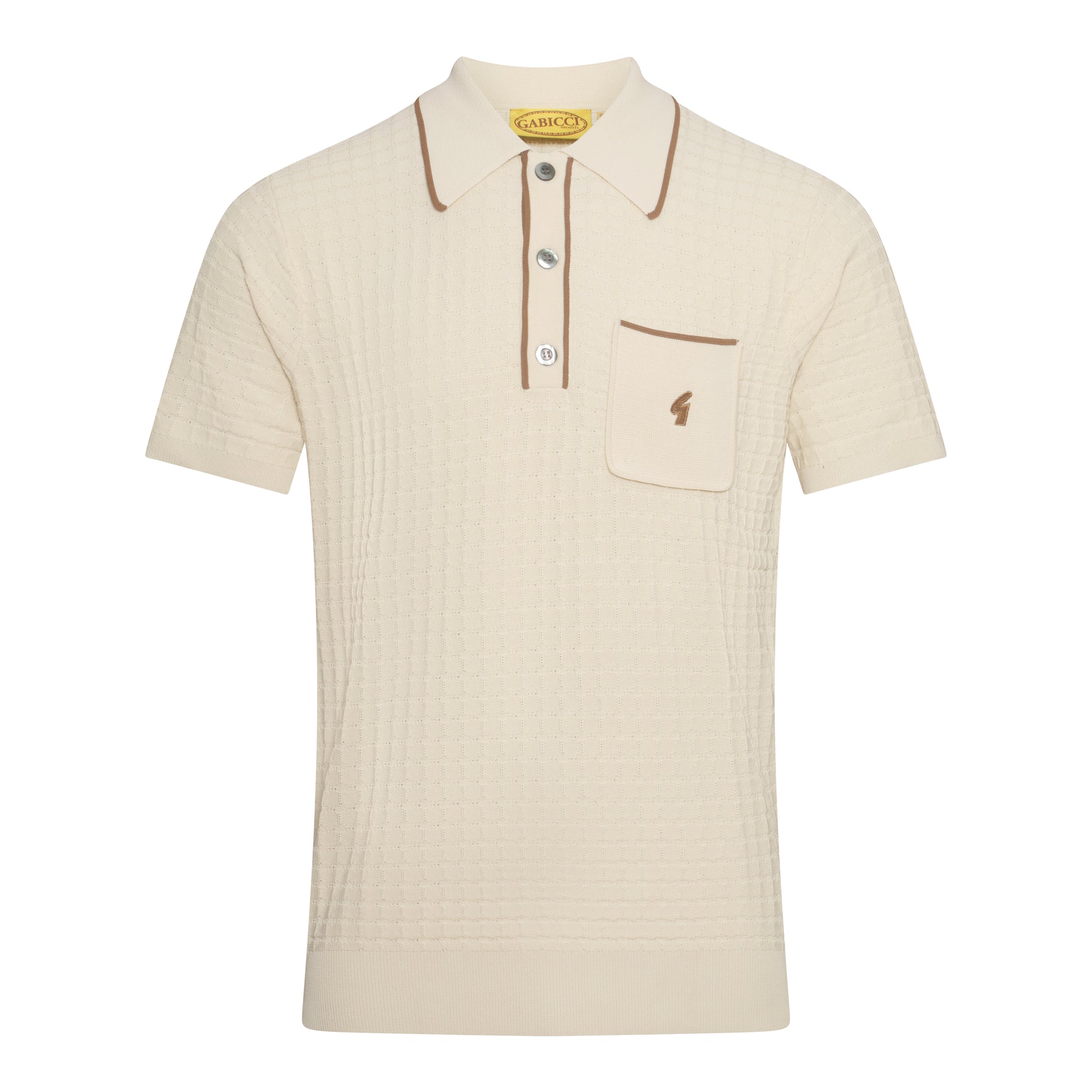 A re-issued classic from the archives of Gabicci, sporting a waffle knitted texture with pocket detailing and the original classic "G" embroidered branding. Crafted in a Polo Shirt Silhouette in a luxury knitted material, perfect for layering under a jacket.