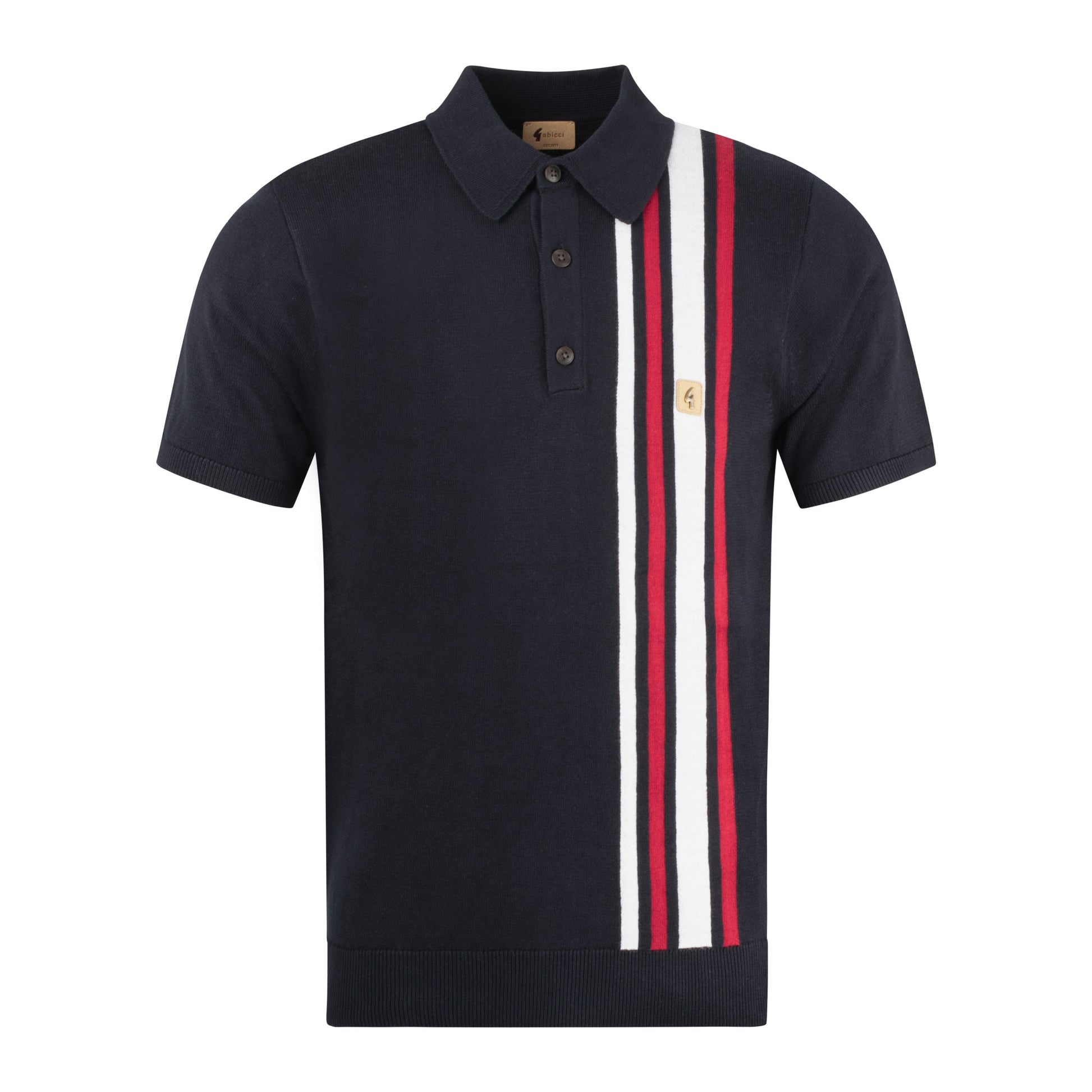 The Gabicci Vintage "Soda" Racing Stripe Knitted Polo Shirt in Navy Blue is available for purchase here at Urban Menswear.