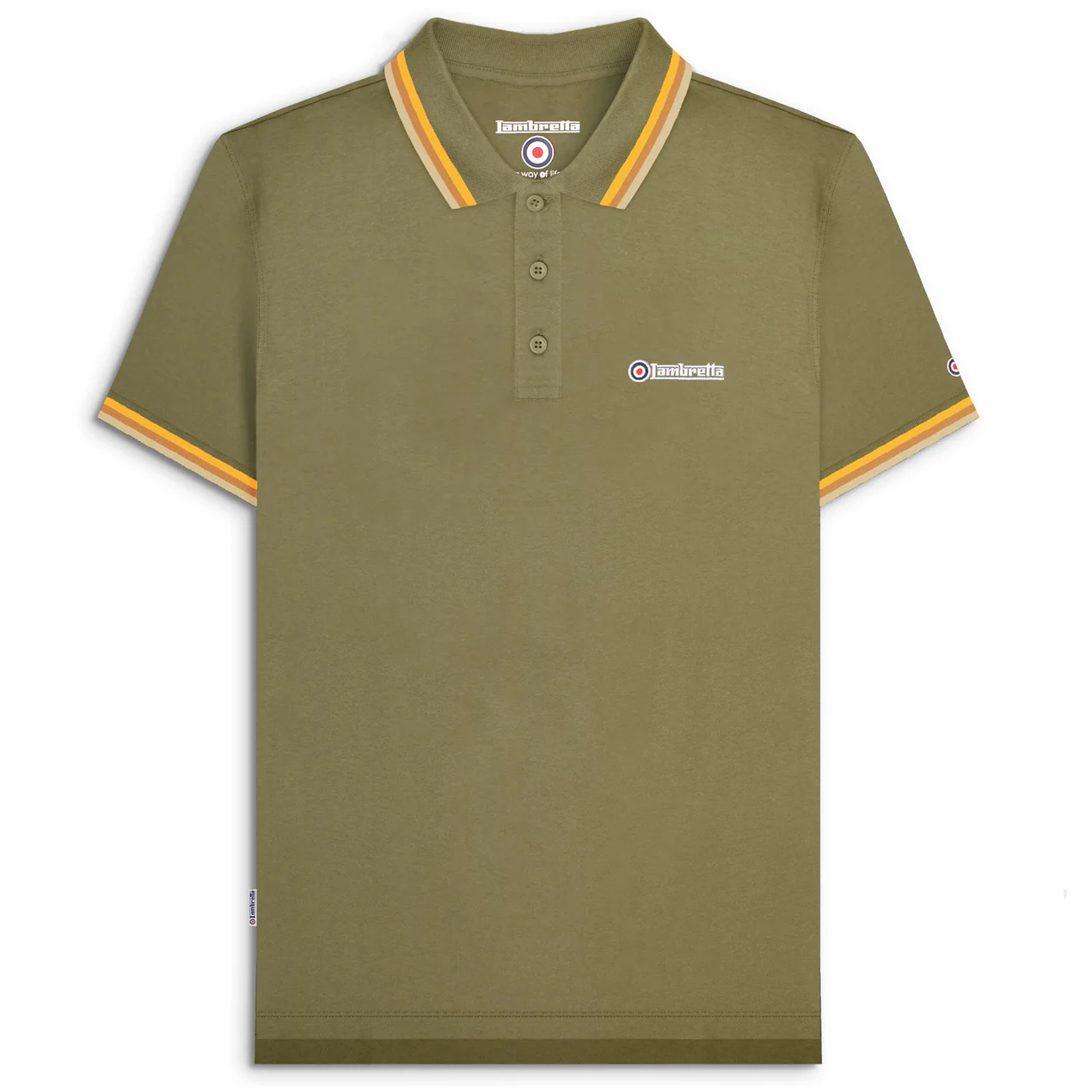 The Mod Triple Tipped Polo Shirt in Khaki Green from Lambretta is available for purchase here at Urban Menswear.