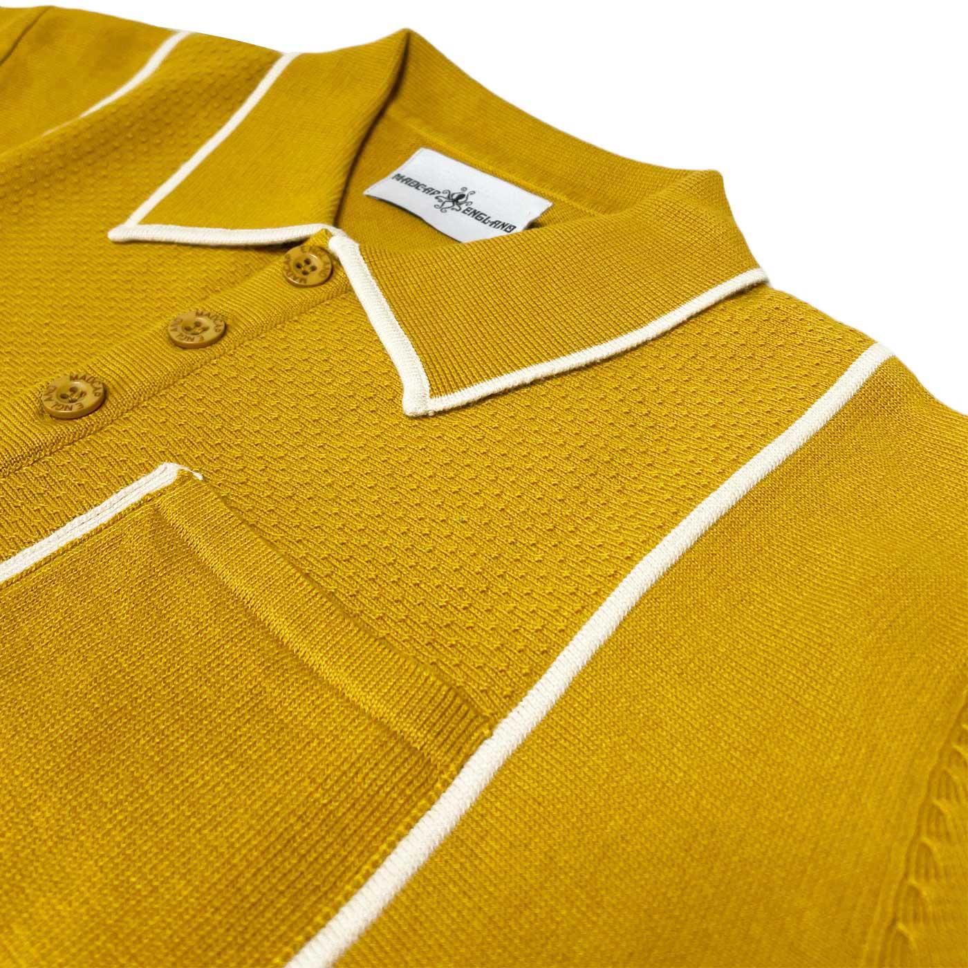 The "Cagney" Piping Knitted Polo Shirt in "Chai Tea" (Mustard) by Madcap is available for purchase here at Urban Menswear.