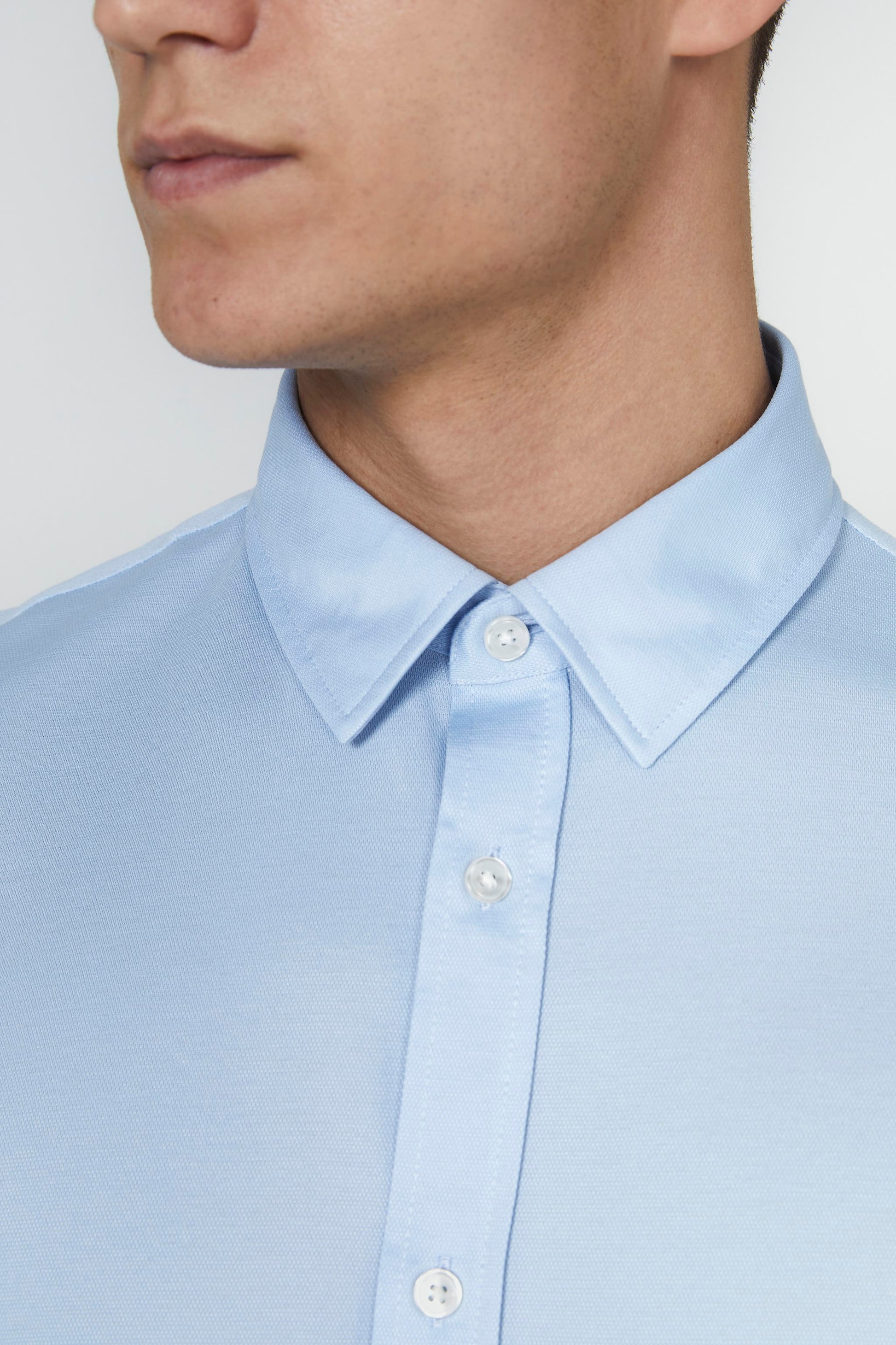 Crafted from a Cotton Blend Jersey fabric, perfect for maintaining the smart appearance of a shirt whilst keeping the comfort and dexterity of a T-Shirt. This garment truly must be worn to be appreciated. Finished with button sleeve cuffs and concealed under-collar button down.