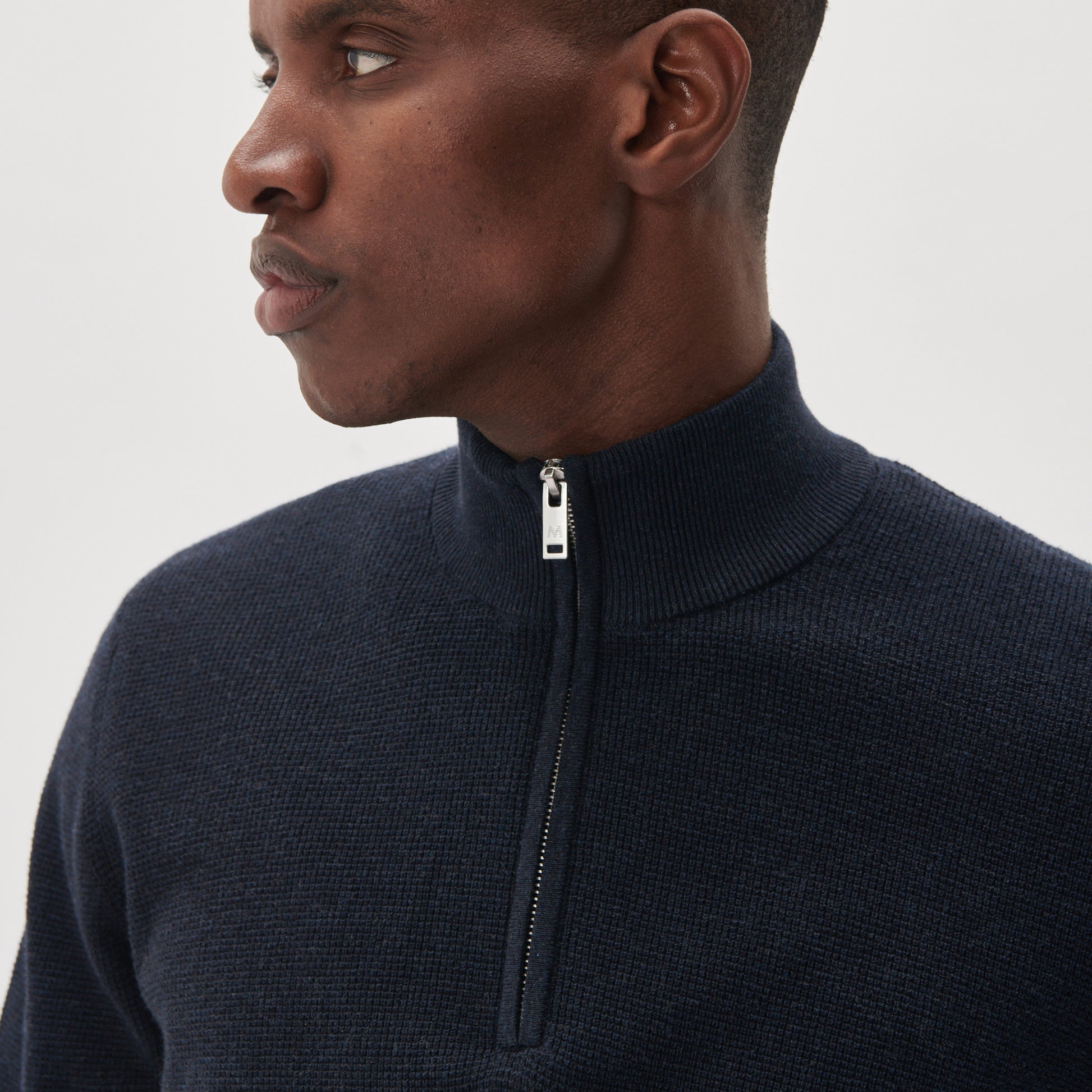 This new season pieces come in a Quarter Zip sweater silhouette, sporting an all over micro textured knit. Crafted with a funnel neckline and finished with cuffed sleeves & bottom hemline.