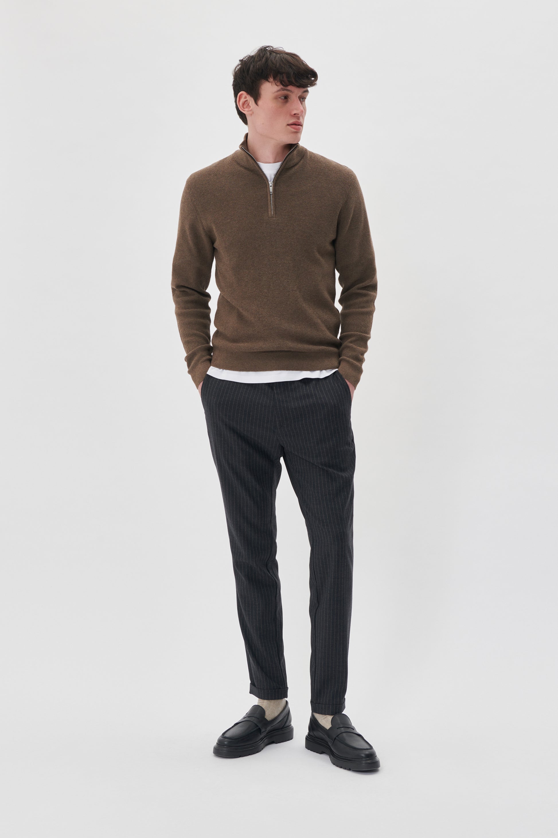 This new season pieces come in a Quarter Zip sweater silhouette, sporting an all over micro textured knit. Crafted with a funnel neckline and finished with cuffed sleeves & bottom hemline.
