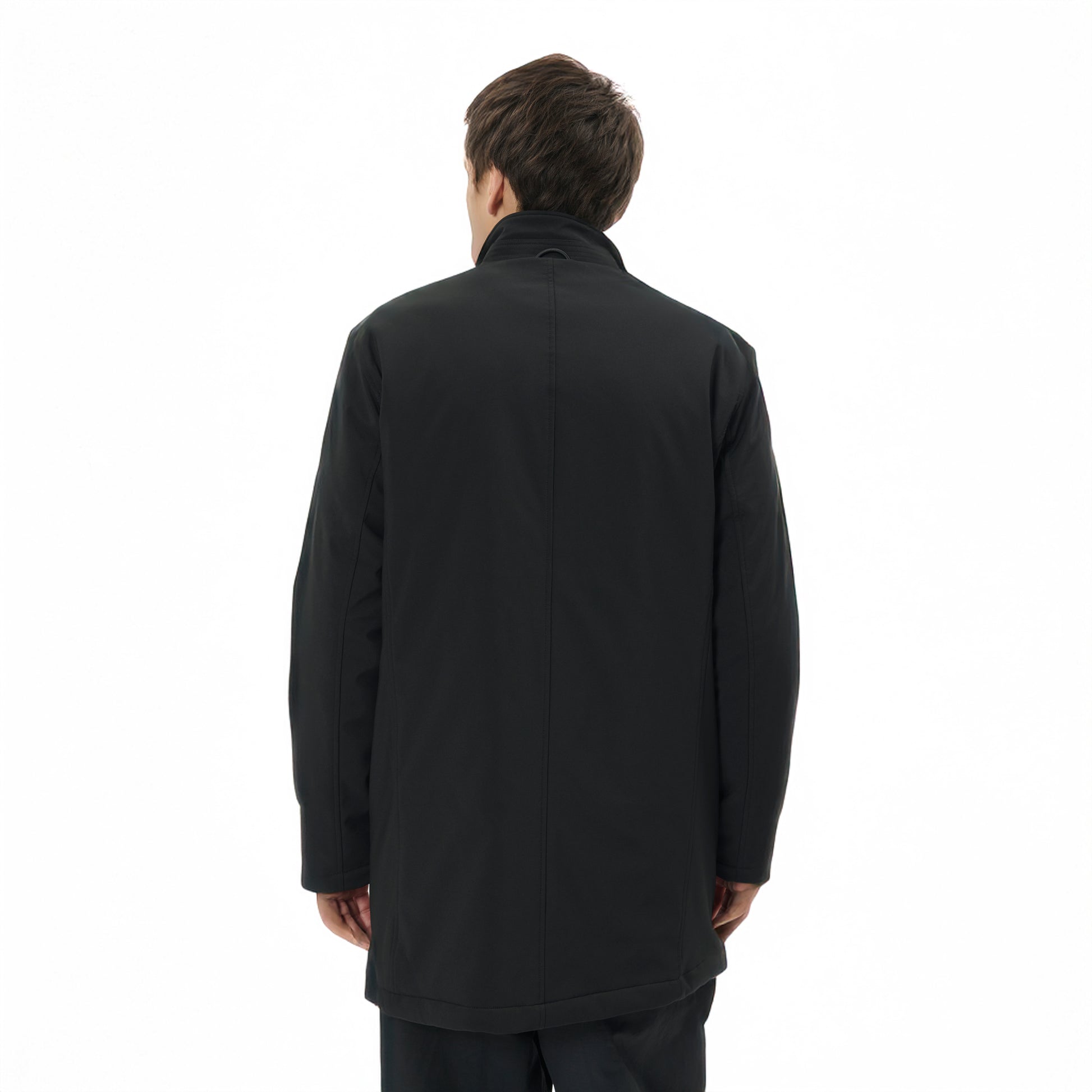 The perfect crossroad between style and versatility. Crafted in an overcoat silhouette finished in a technical outer shell with a winter quilted lining. Finished with two side pockets, inside pockets and a full zip front with button down concealing flap.