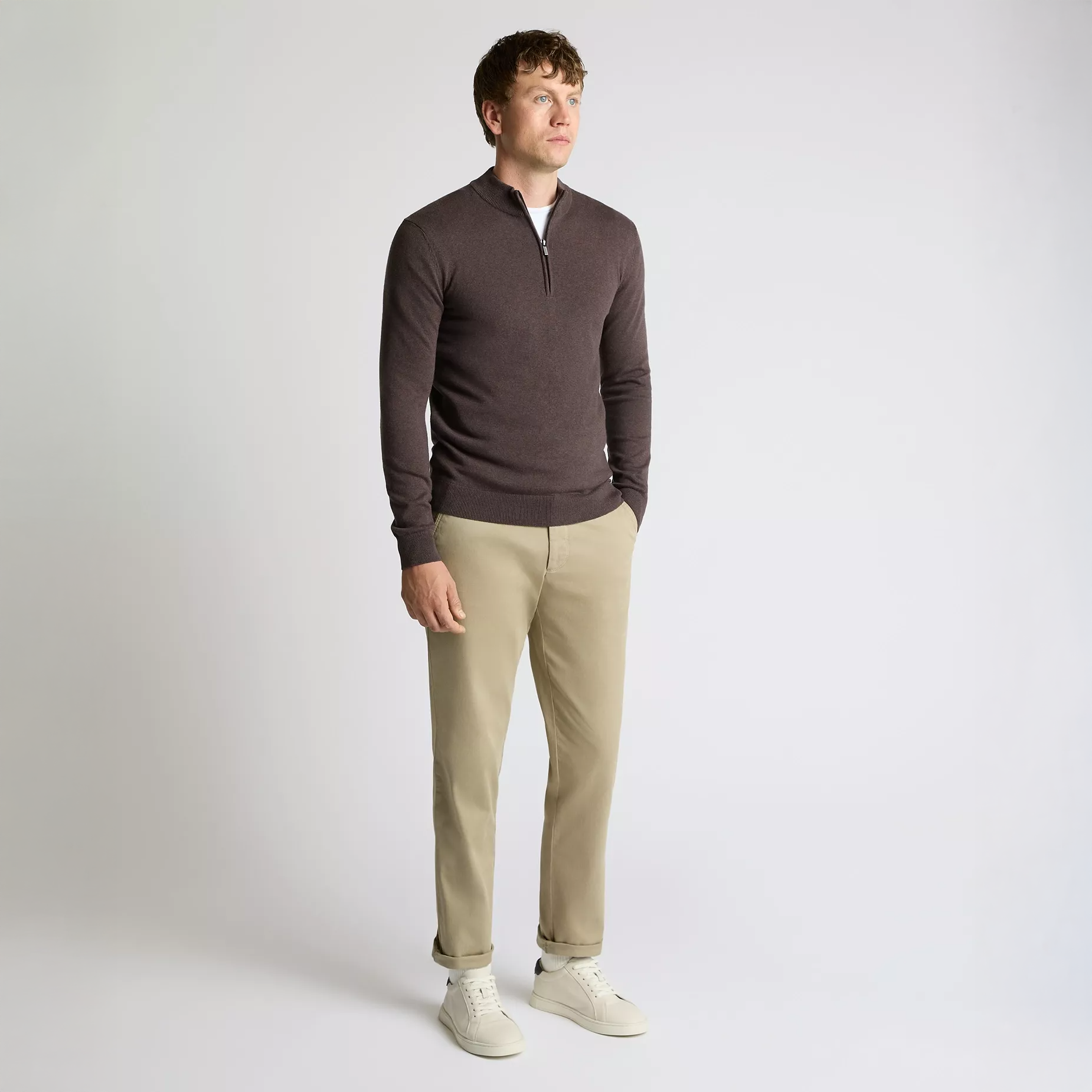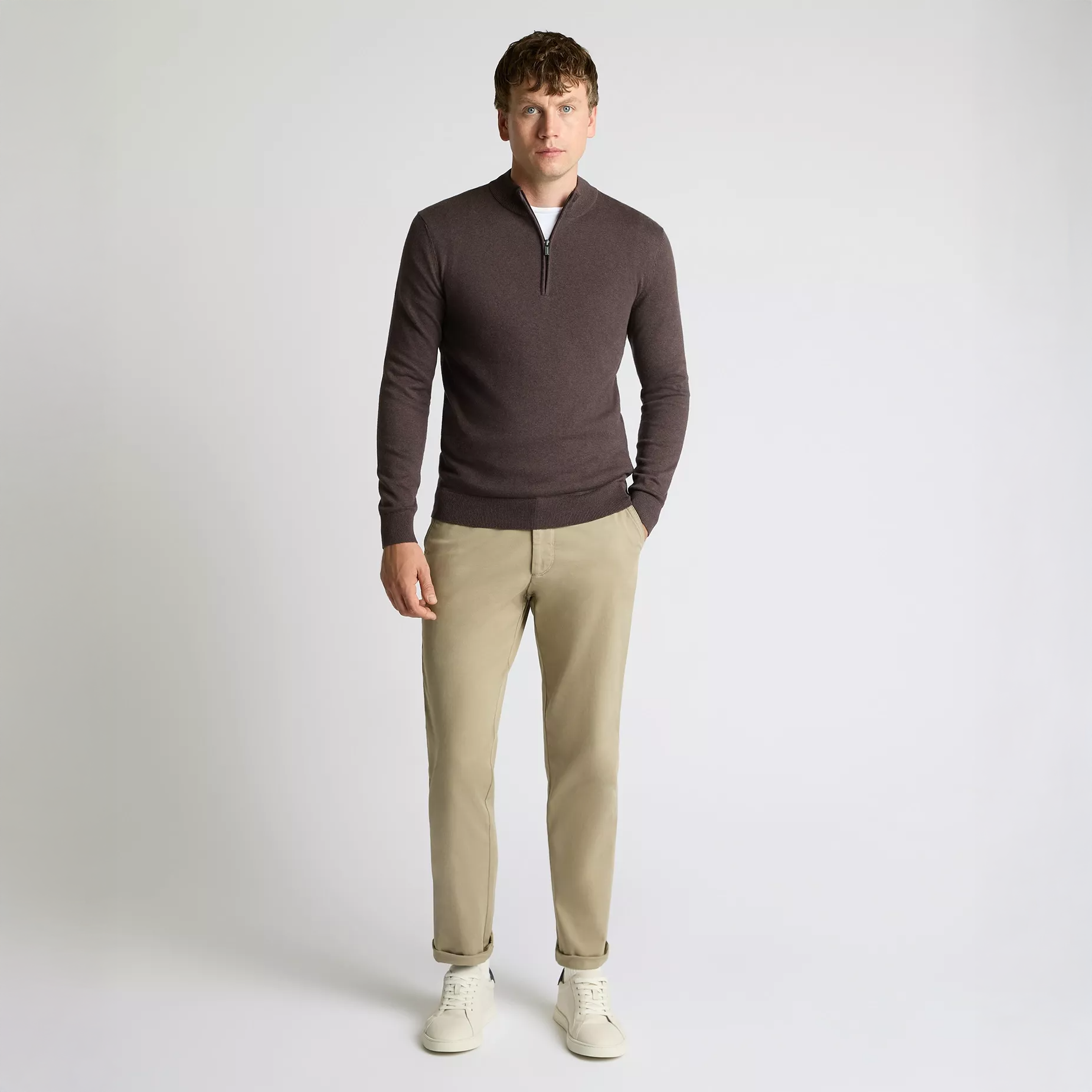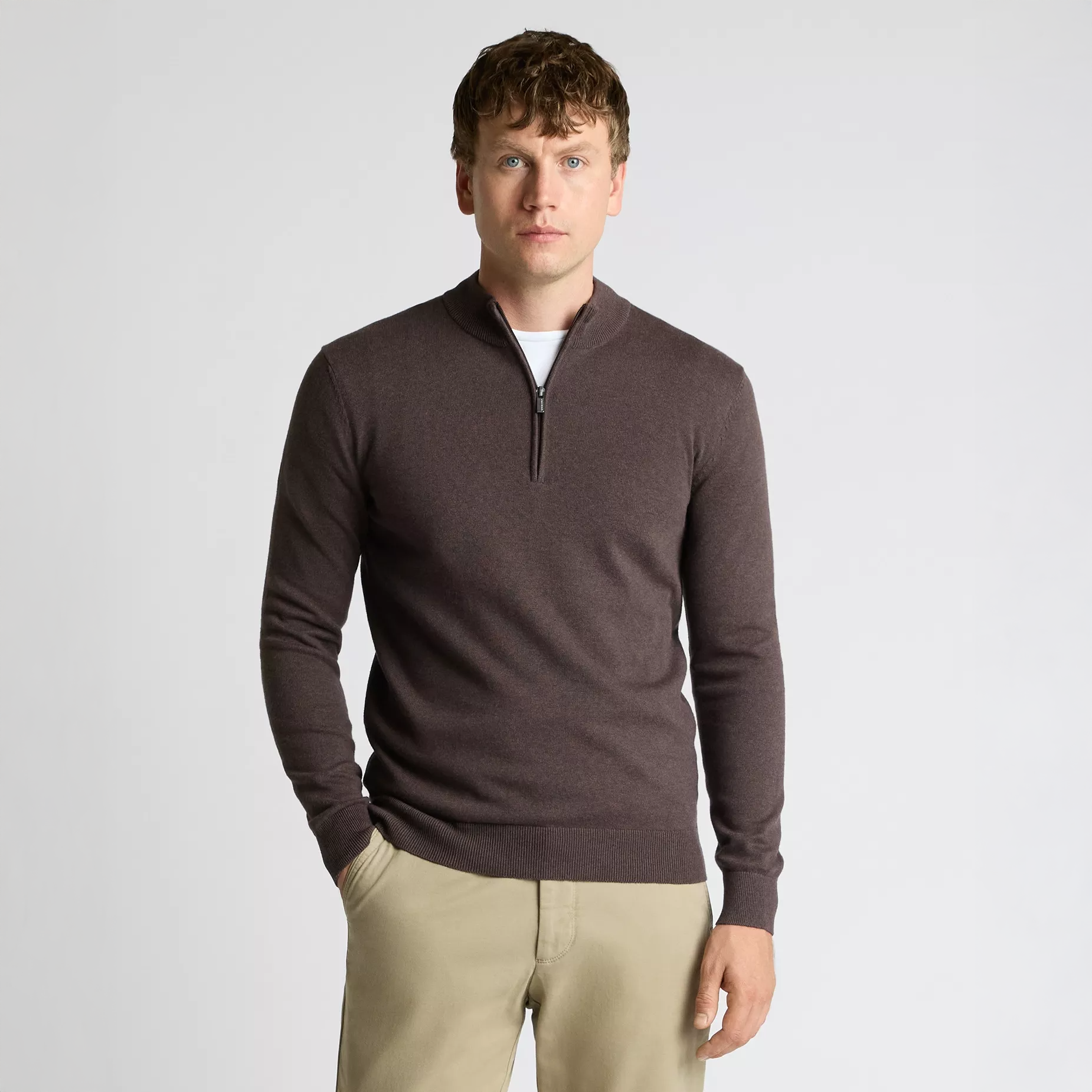 A wardrobe must have for layering some tonal colours into smart casual outfits. Crafted from a soft cotton knit in tapered fit and finished with a 1/4 zip and subtle mock neckline.