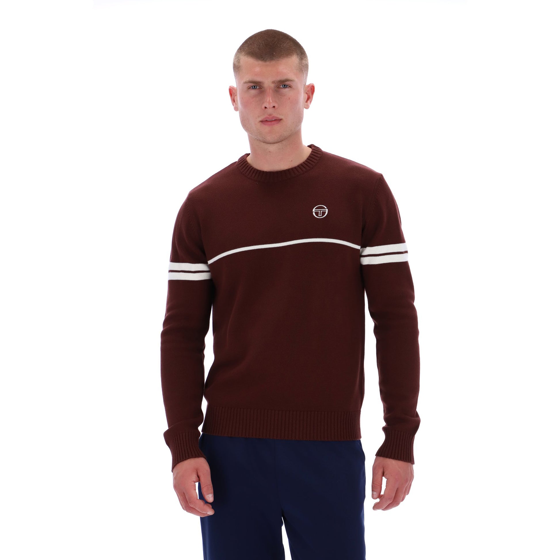 The Sergio Tacchini "Orion" Knitted Crewneck Sweatshirt in Brown & White is available for purchase here at Urban Menswear.