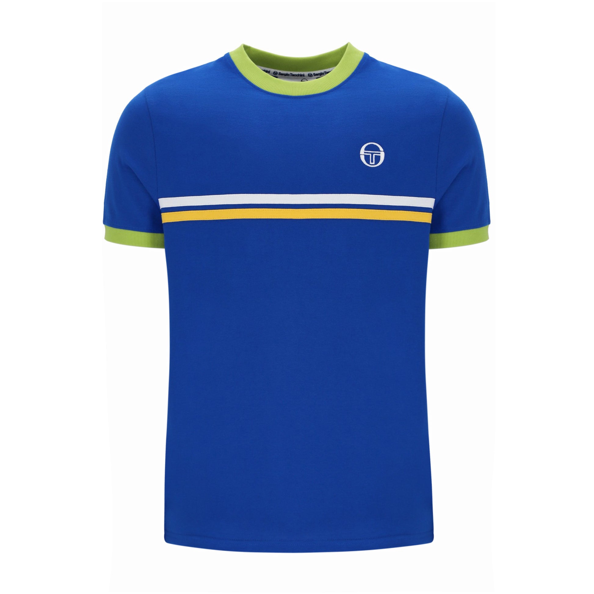 The Sergio Tacchini "Supermac" T-Shirt in Nautical Blue, Yellow & Green is available for purchase here at Urban Menswear.