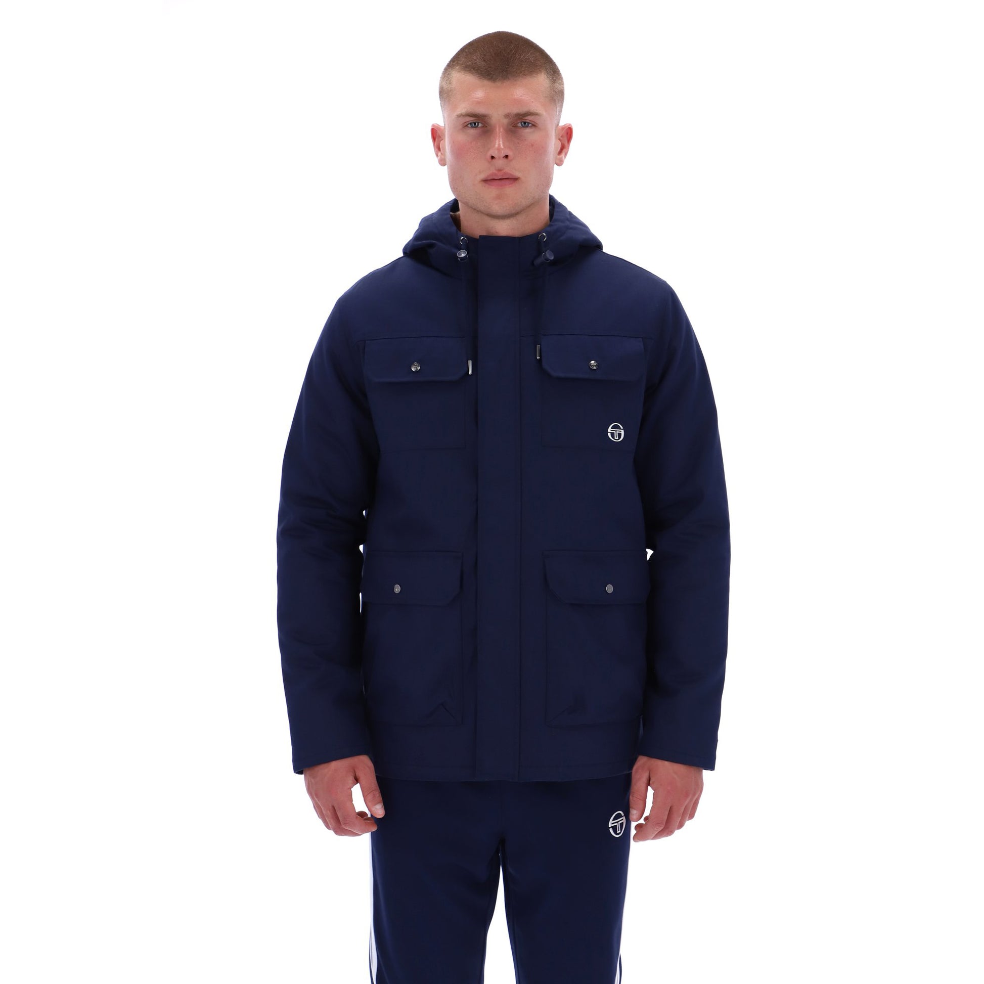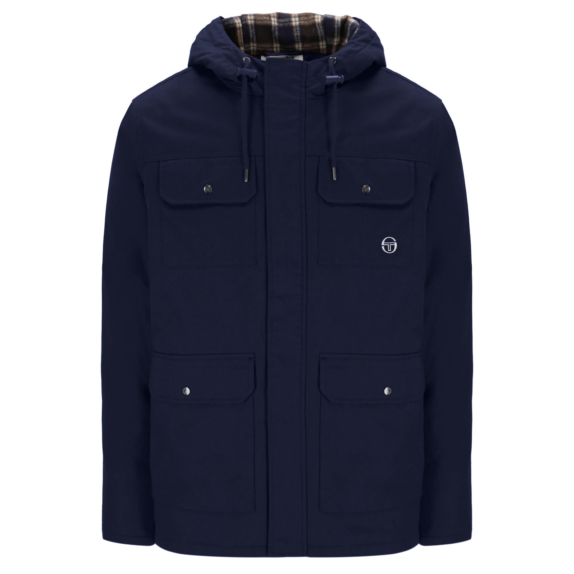 Brand new in the AW25 range from Sergio Tacchini is this stunning Hooded Field Jacket, The "Weaver". Sporting 4 exterior pockets, one zipped internal pocket, Checked Hood Lining and ST branding on the chest and rear neckline. Constructed with a cotton exterior & polyester lining, perfect for keeping it smart casual in the colder climates.