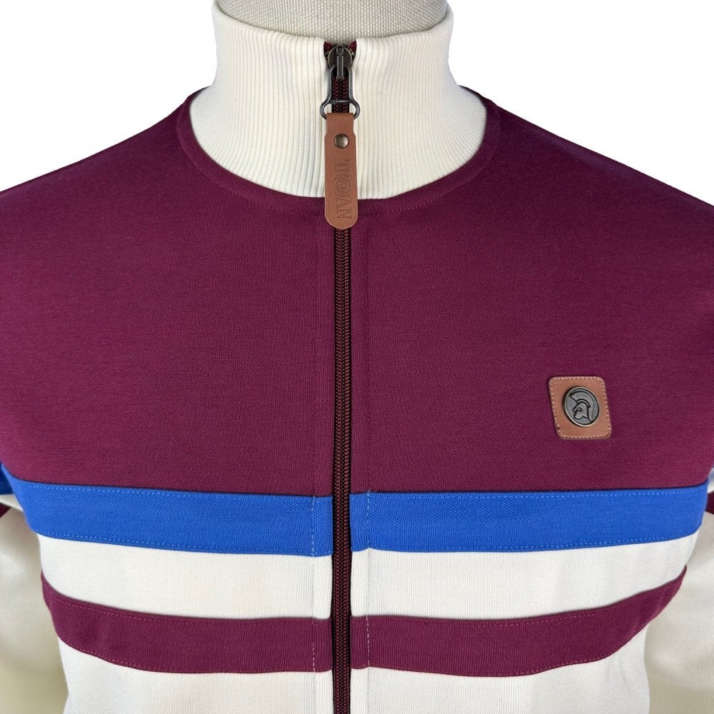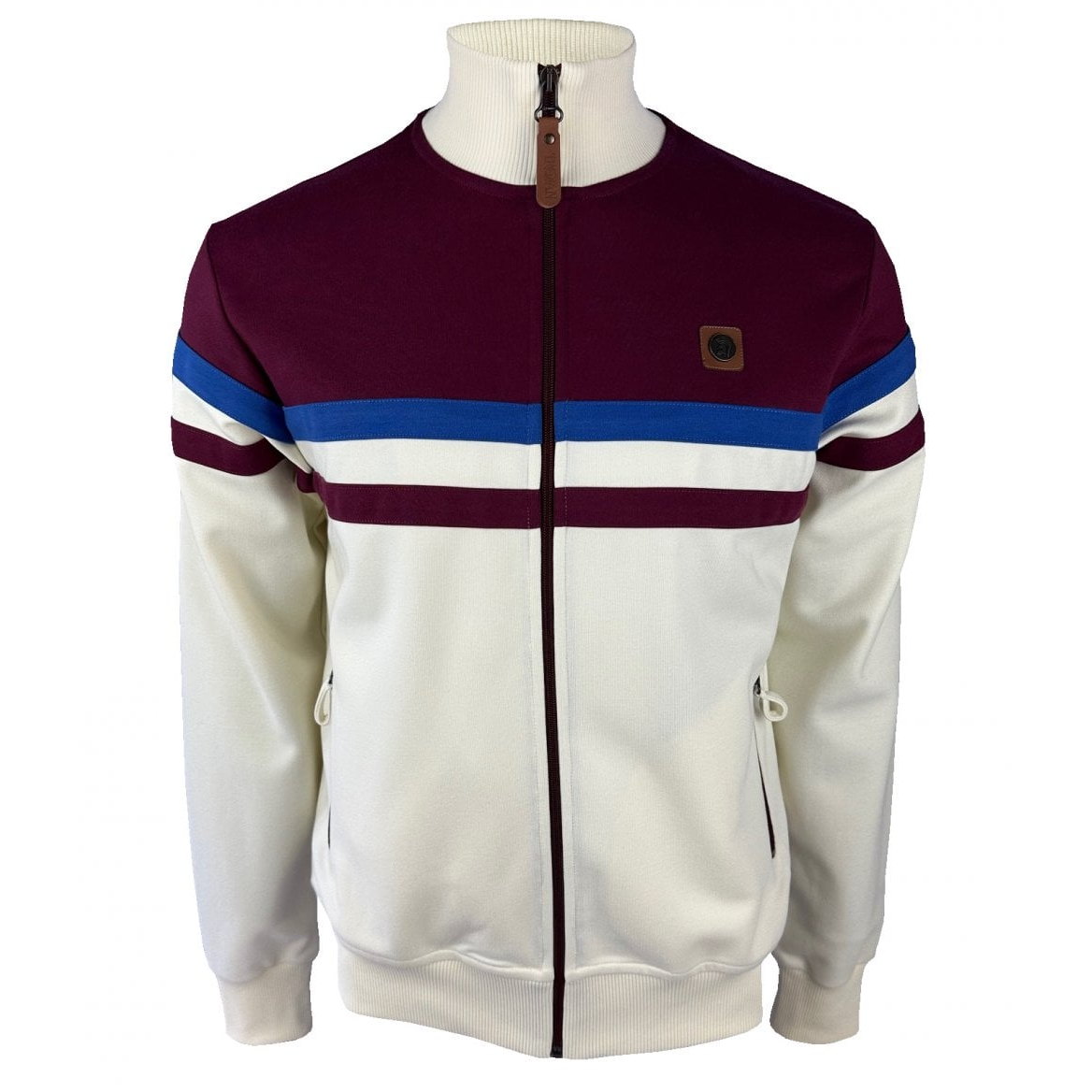 The "Stripe Panel" Track Top in Claret, Ecru (Cream) & Blue by Trojan Records is available for purchase here at Urban Menswear.