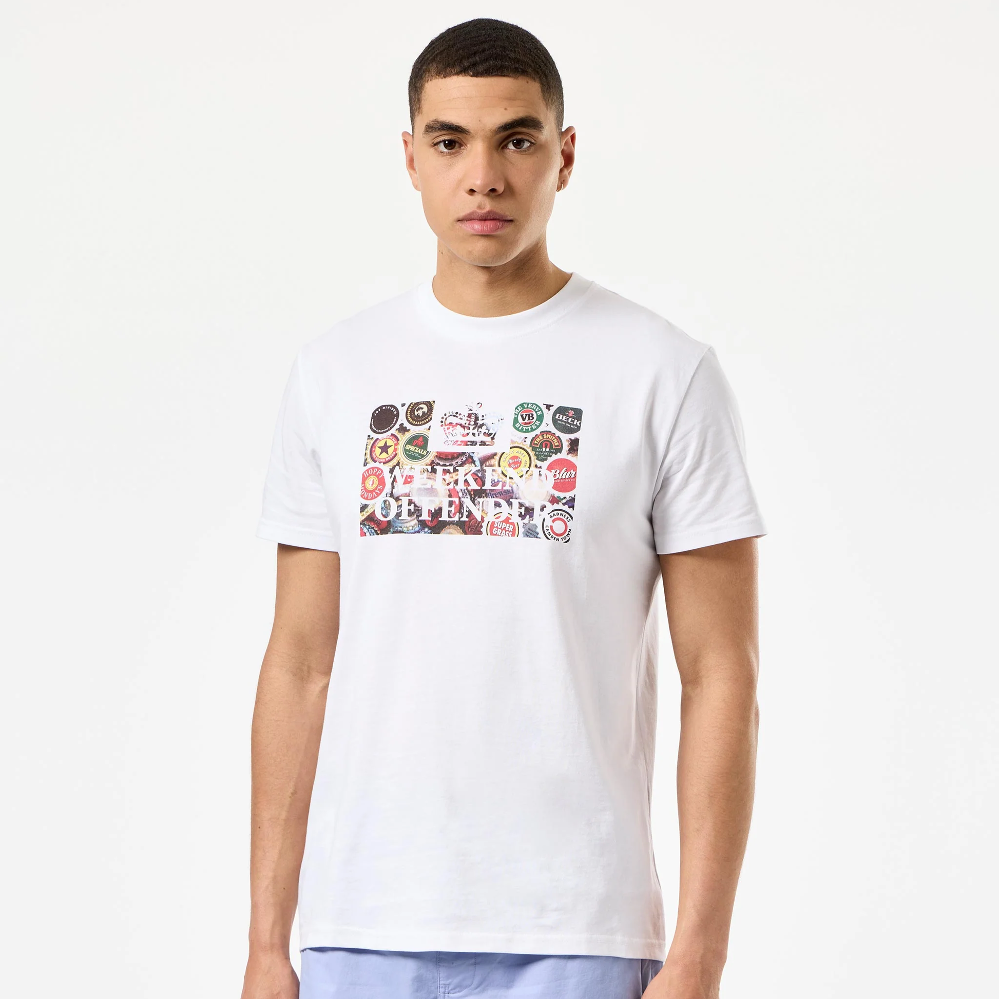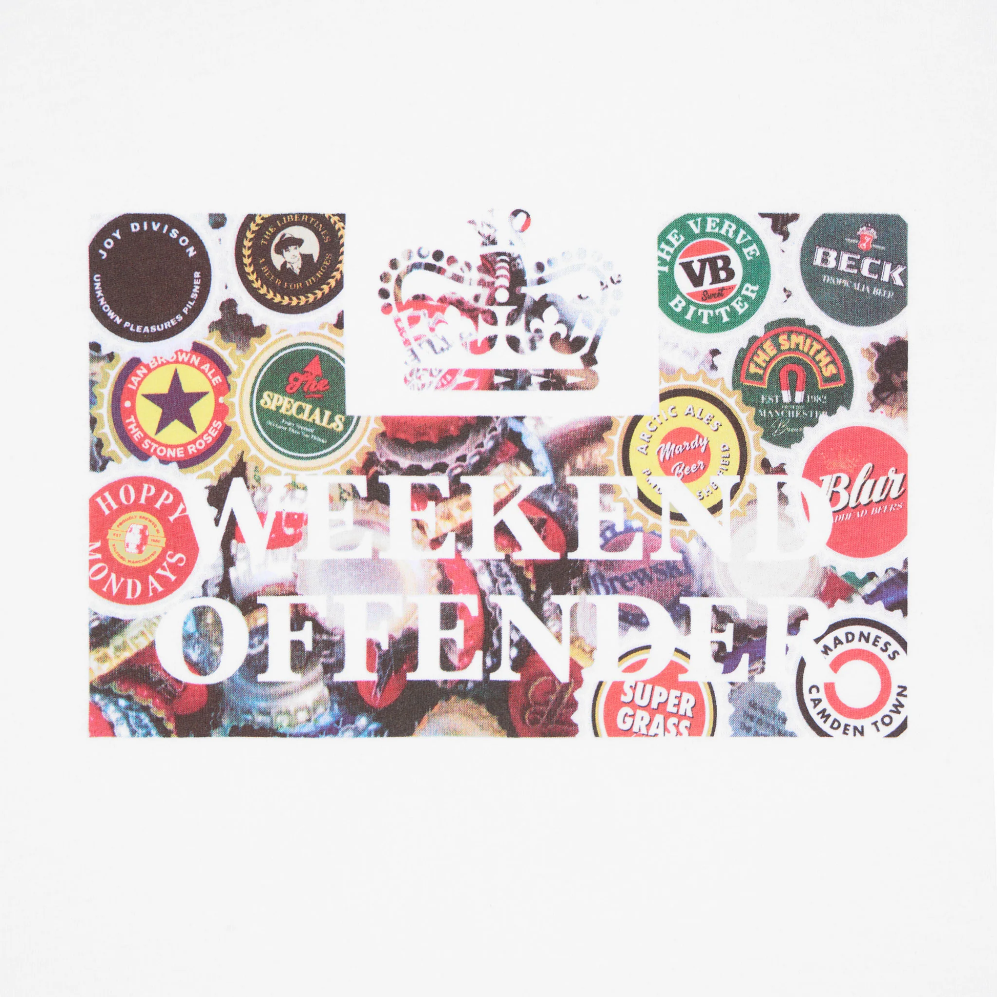 Showcasing a collage of bottle caps, if musicians did bottle caps, in the iconic HMP Weekend Offender motif. Constructed in a Short Sleeve T-Shirt silhouette with a crewneck.