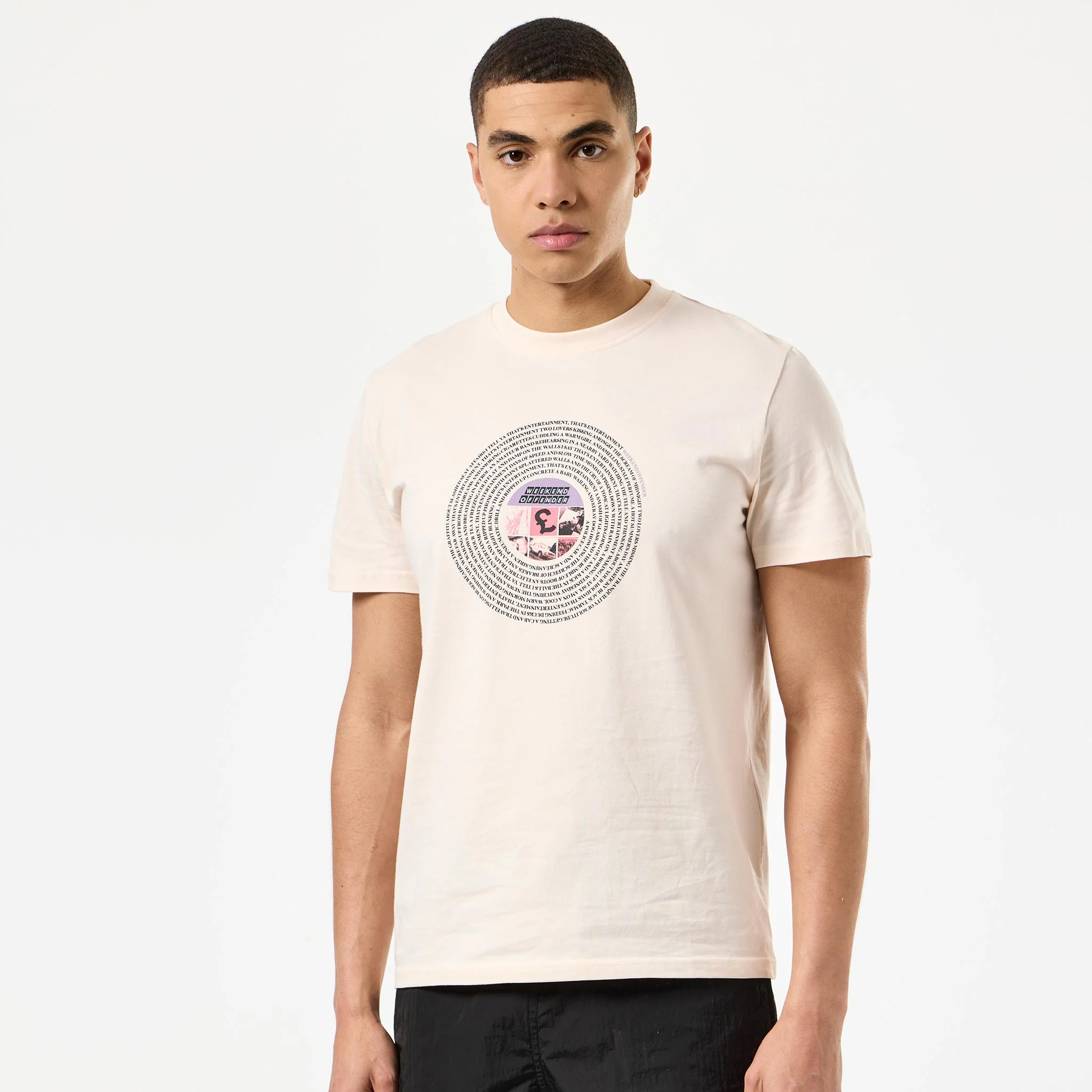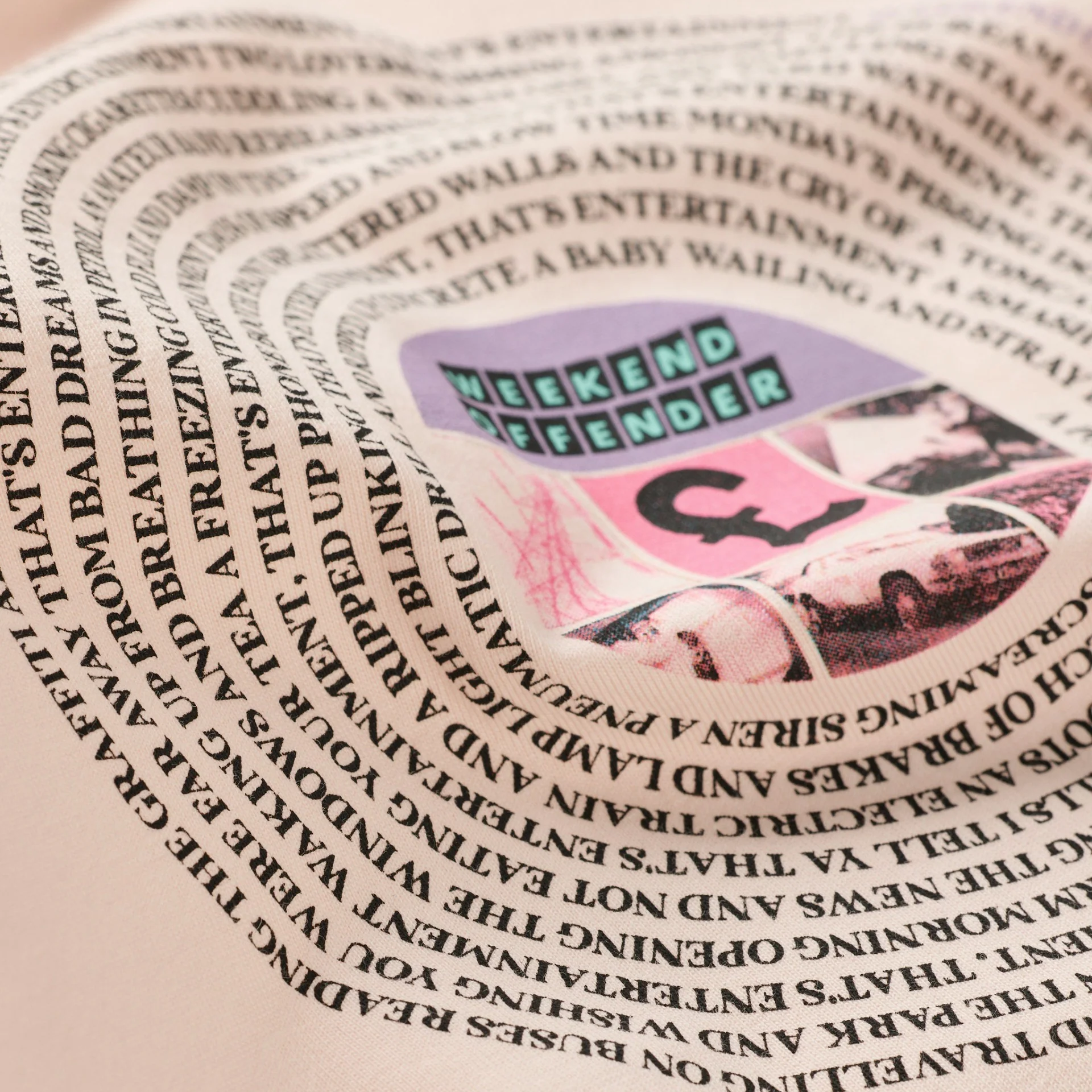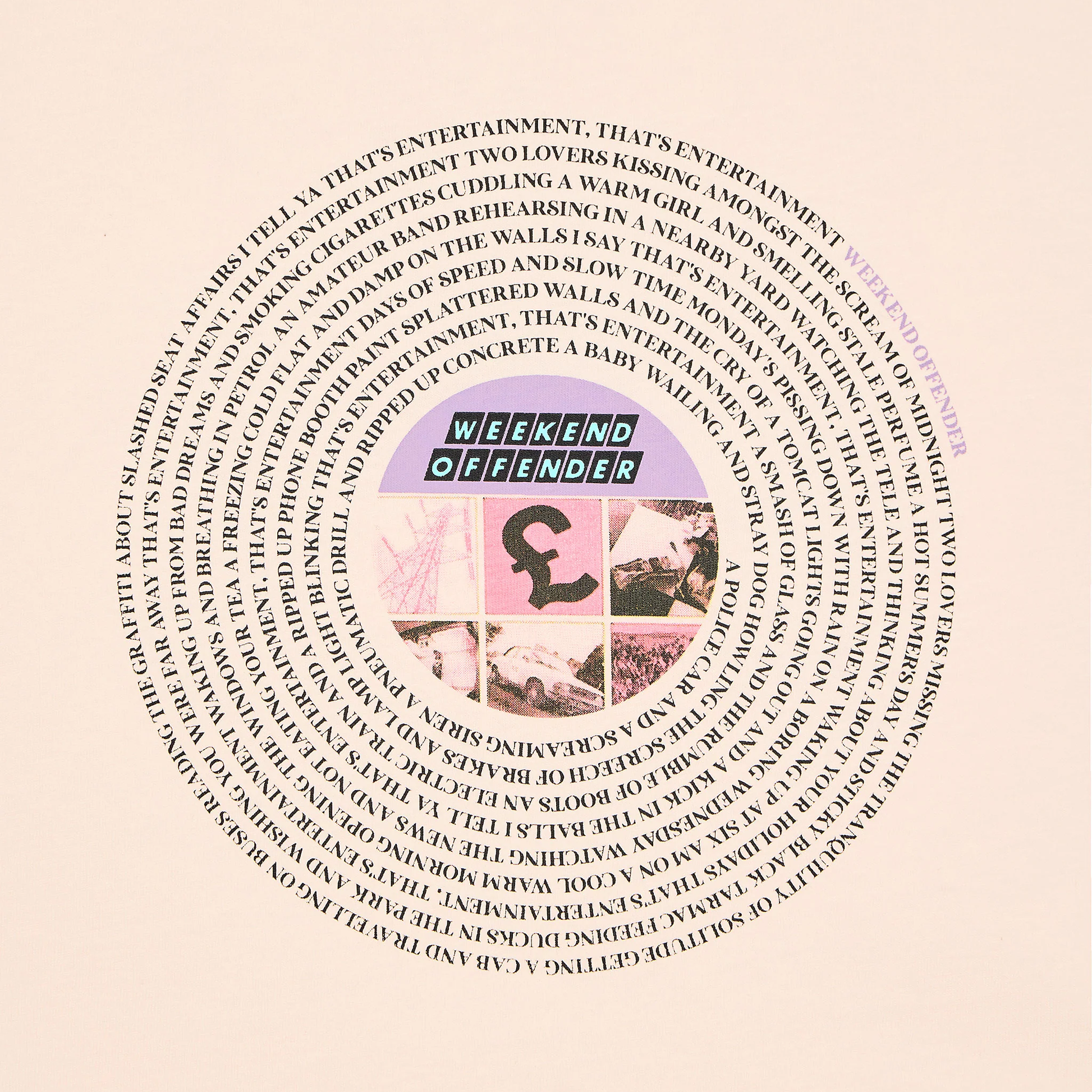Designed in the shape of a vinyl records, the lyrics to "That's Entertainment" by The Jam. Constructed in a Short Sleeve T-Shirt silhouette with a crewneck.