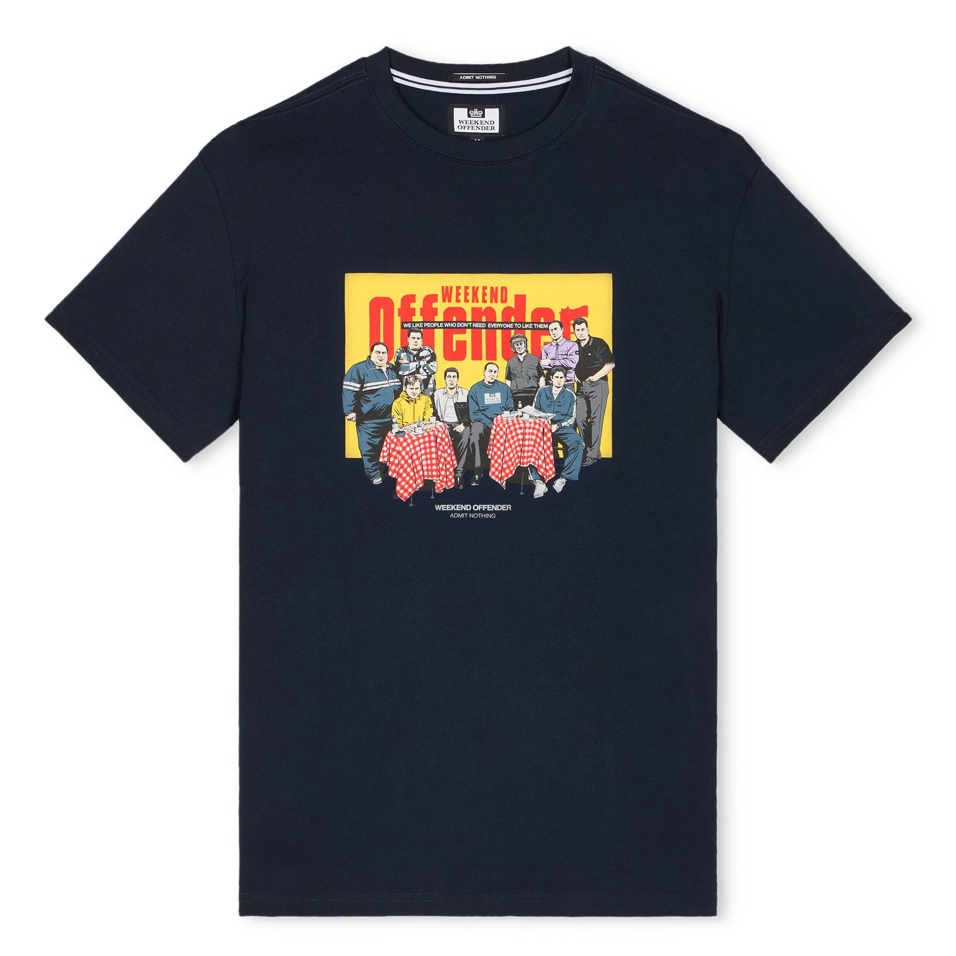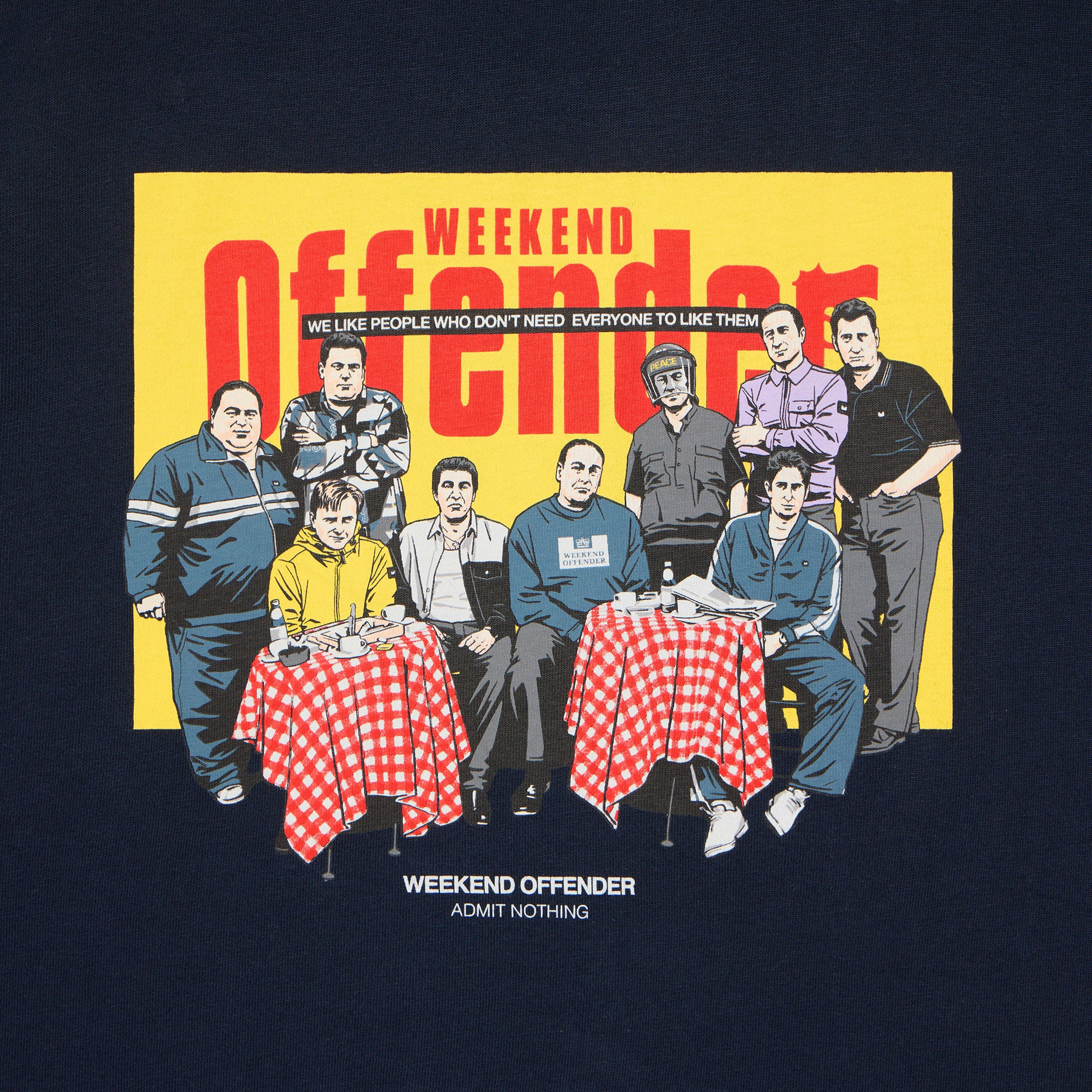 Featuring a graphic design of the Soprano's crew re-imagined in Weekend Offender gear outside Satriale's Pork Shop, a key meeting point in the franchise. Constructed from 100% Cotton with short sleeves & crew neckline.