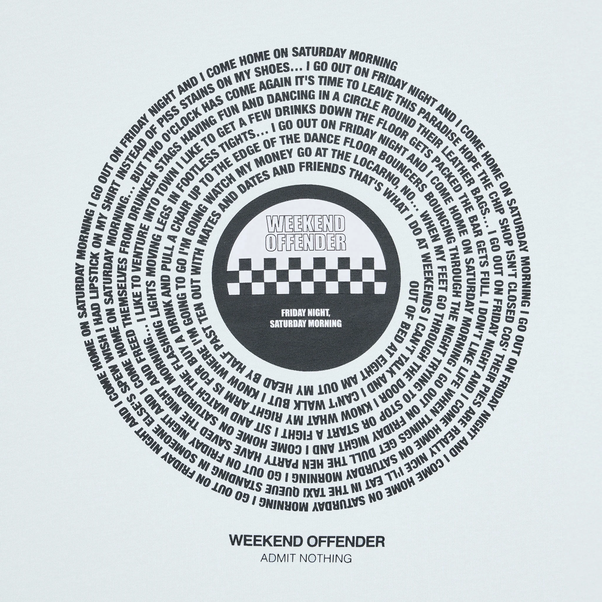 Featuring a graphic design of lyrics to the Specials song Friday Night, Saturday Morning in the shape of a vinyl record. Constructed from 100% Cotton with short sleeves & crew neckline.